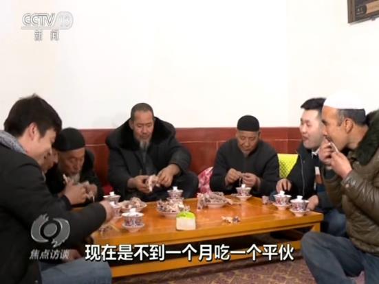 吃平伙是東鄉(xiāng)族老百姓的一個傳統(tǒng),就是大家買一只羊,平攤價格以后搭伙吃羊肉。過去,只有家里娶媳婦、蓋房子這樣的大事,才能吃個平伙?,F(xiàn)在生活好了,家里請客的時候也吃平伙,今天,馬麥志要請客,不用大家出份子錢了。他說大兒子在外面打工,自己在干清潔工,媳婦在車間里面炸油馃馃,收入應(yīng)該有3萬多元。