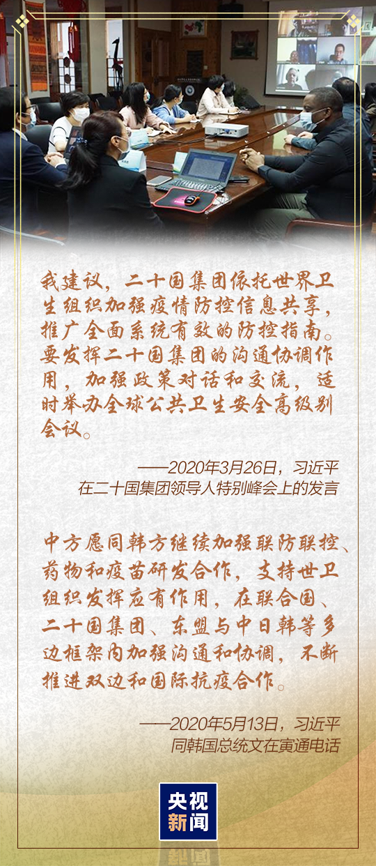3月26日晚舉行的二十國(guó)集團(tuán)領(lǐng)導(dǎo)人特別峰會(huì)上,習(xí)近平主席宣布“同各國(guó)分享防控有益做法,開(kāi)展藥物和疫苗聯(lián)合研發(fā)”“探討建立區(qū)域公共衛(wèi)生應(yīng)急聯(lián)絡(luò)機(jī)制”“加大向國(guó)際市場(chǎng)供應(yīng)原料藥、生活必需品、防疫物資等產(chǎn)品”……